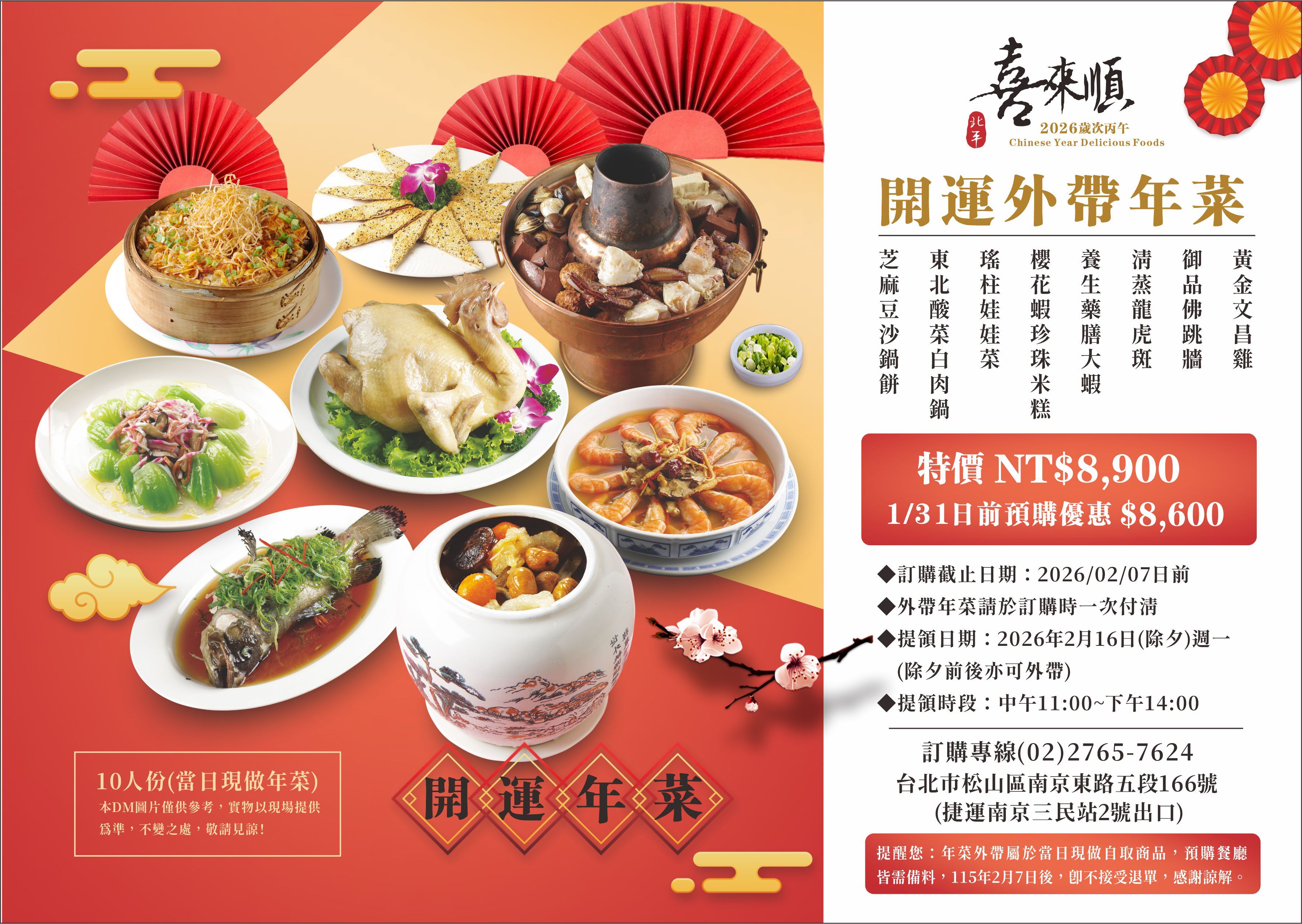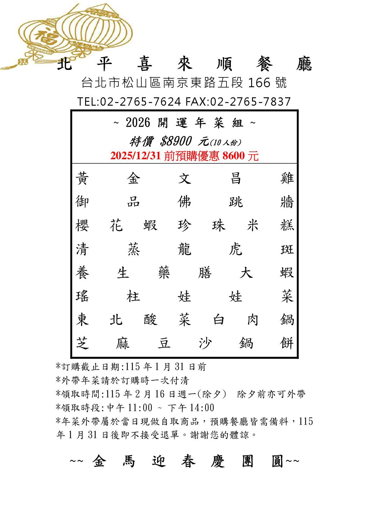 ( 北平喜來順)馬年開運年菜外帶-1/31前預購特價8600元